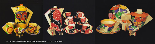 Vagamente inspirado no modelo Conical – Odilon, criado pela inglesa Clarice Cliff, em 1929, da linha Bizarre, a versão portuguesa apresenta bastantes diferenças na forma das peças em relação à sua, eventual, fonte de inspiração. Não há dúvidas que a forma da leiteira e a base, em cruz grega, do açucareiro, remetem para o modelo inglês, tal como as pegas das tampas. Mas estas são as únicas semelhanças pois em relação às demais formas só encontramos diferenças: o açucareiro na versão inglesa é perfeitamente cónico e não em calote esférica como o modelo VA, forma que se repete nas chávenas de asa cúbica; no bule inverte-se o sentido troncocónico do corpo da peça e também a asa e o bico não acompanham o modelo inglês. E mesmo a leiteira da versão portuguesa apresenta uma subtil curvatura junto à base que contraria a forma troncocónica do original. Demasiadas diferenças para uma filiação directa que alguns pretendem ver.